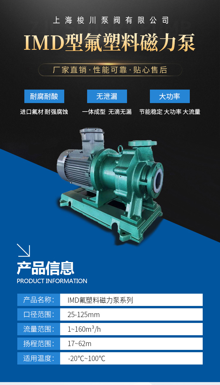 IMD系列磁力泵,適用于輸送強腐蝕,易燃、易爆、有毒、易揮發(fā)的化學介質。適用溫度:-20℃~100℃