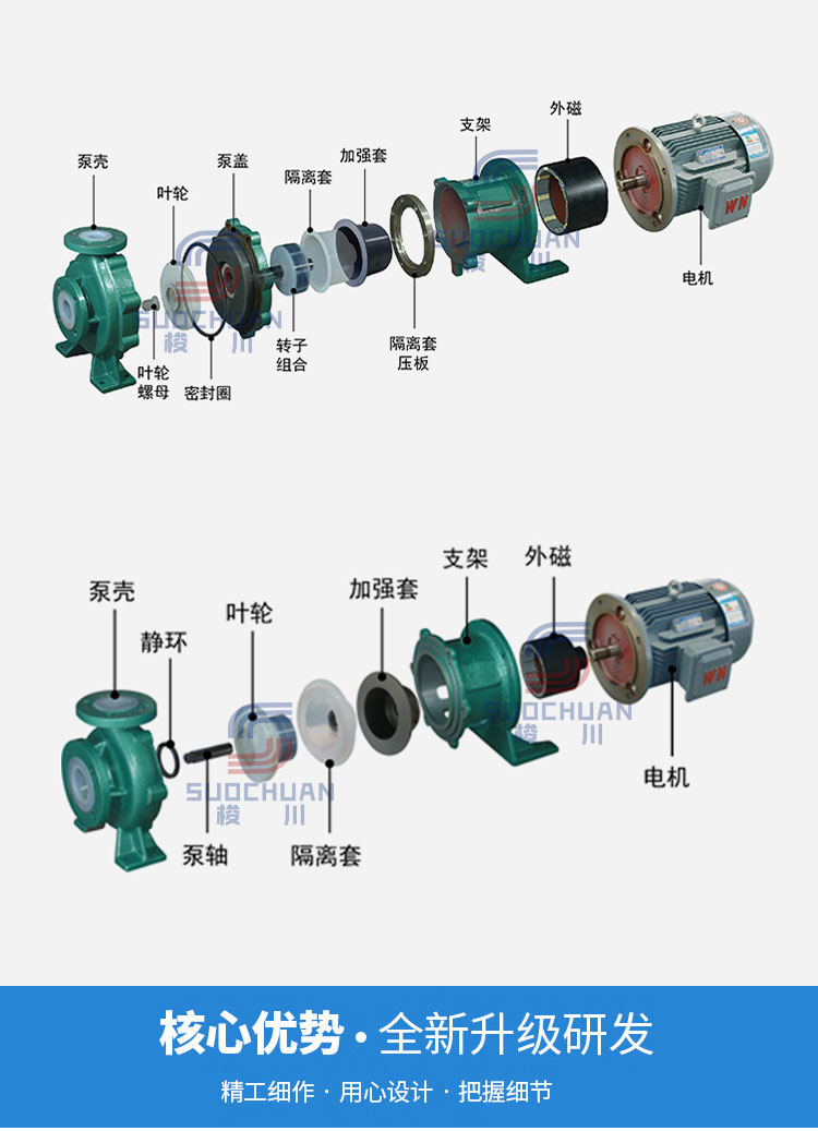 IMD系列磁力驅動泵,取消了軸封,利用磁力偶合間接傳動,有效消除了滴漏的現(xiàn)象。