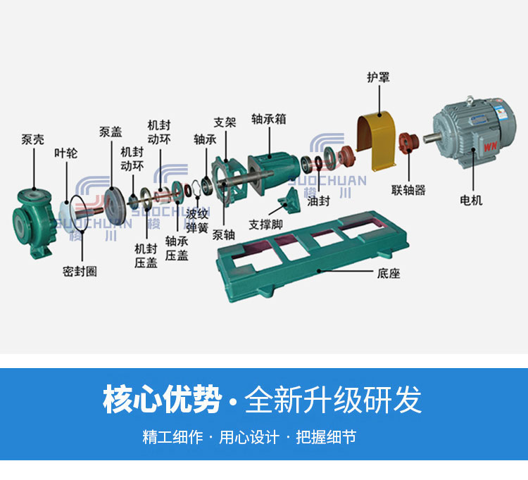 泵體和泵蓋均采用金屬(HT200)基體內(nèi)襯氟塑料,葉輪采用金屬嵌件(WCB)外包氟塑料合金壓制成型。優(yōu)點(diǎn):耐腐蝕性范圍廣,強(qiáng)度高,經(jīng)久耐用。