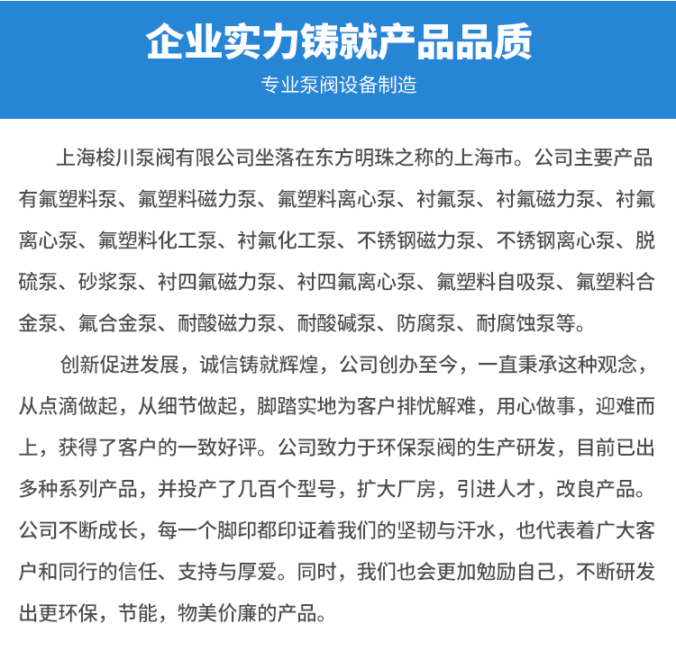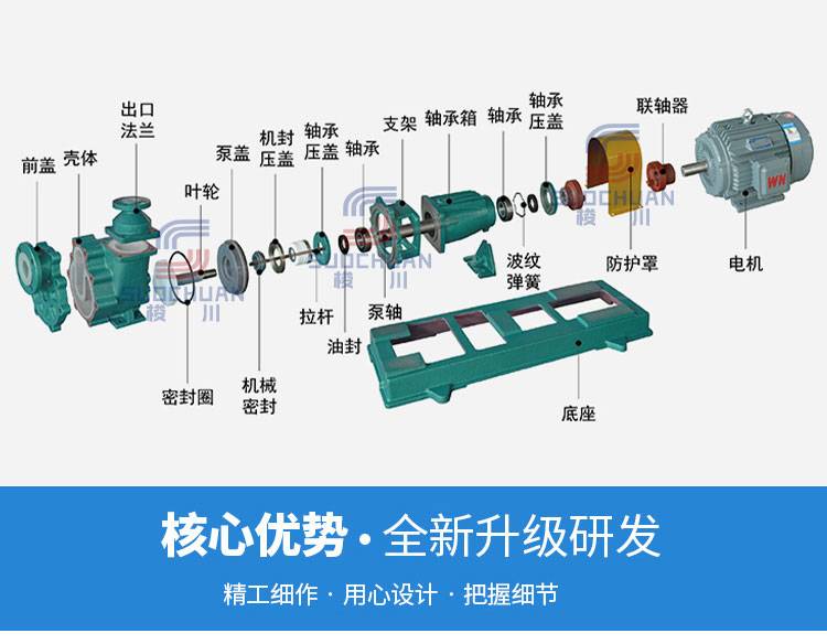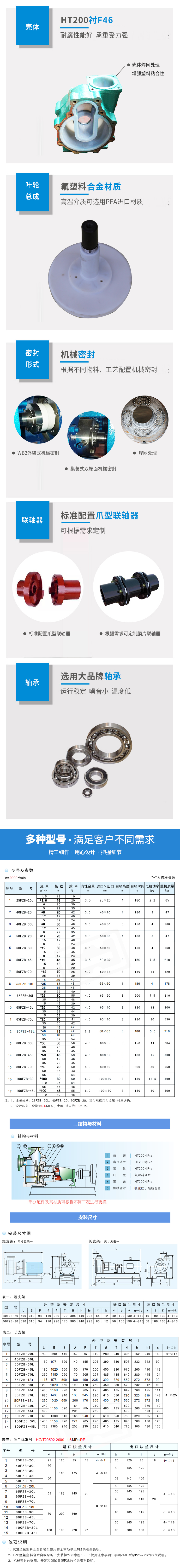 過流部件采用氟塑料、氟塑料合金制造,耐腐蝕性能優(yōu)異。基體采用金屬材料制造,耐壓能力強(qiáng)。