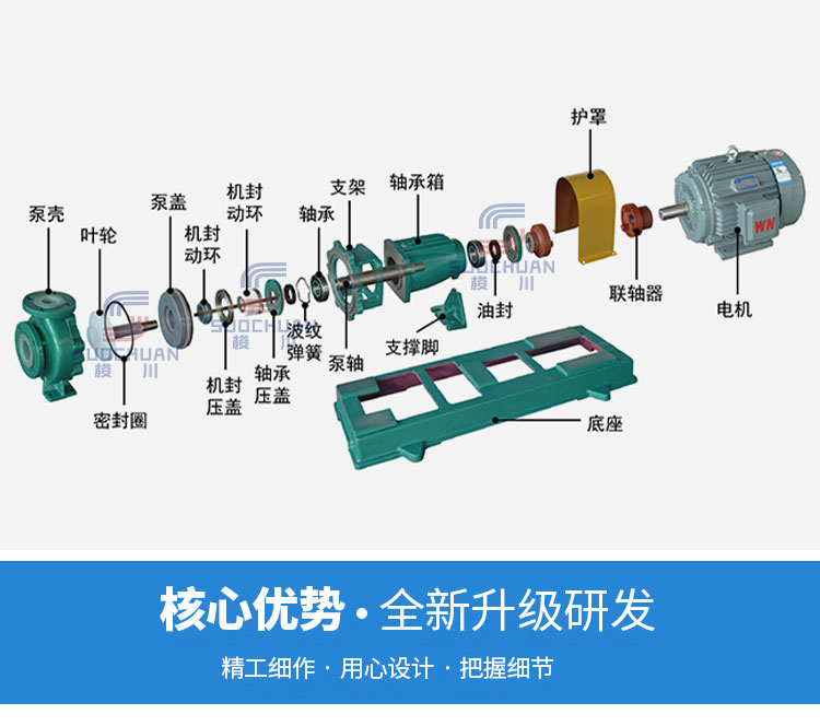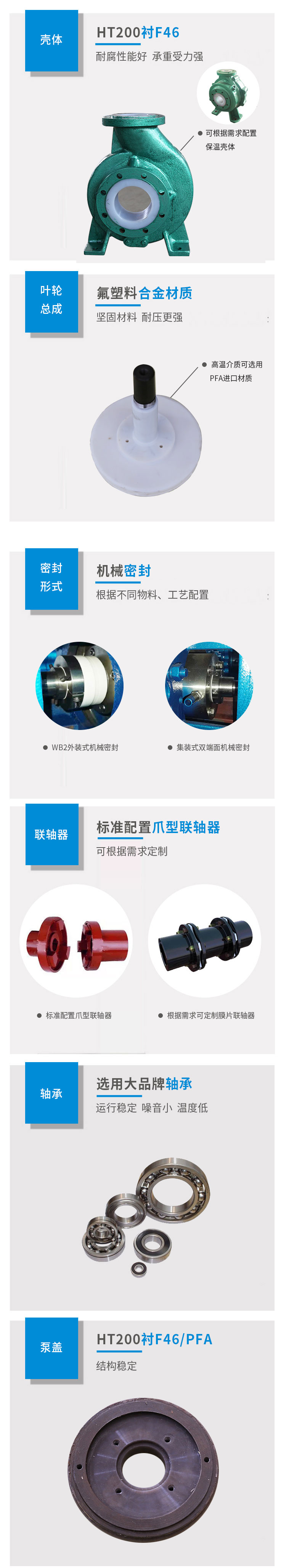 泵體和泵蓋均采用金屬(HT200)基體內(nèi)襯氟塑料,葉輪采用金屬嵌件(WCB)外包氟塑料合金壓制成型。優(yōu)點:耐腐蝕性范圍廣,強(qiáng)度高,經(jīng)久耐用。