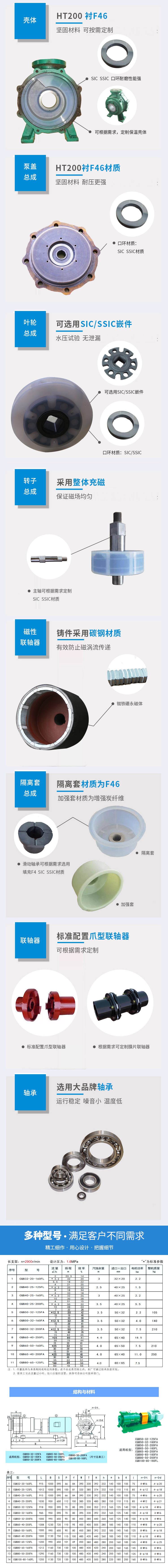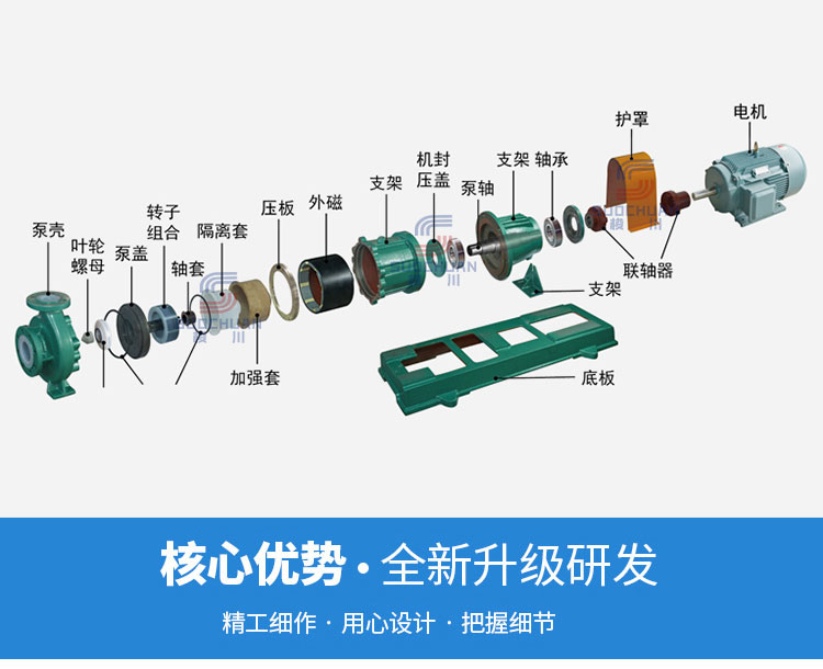 防漏設計取消了軸封,利用磁力耦合間接驅動,有效消除了滴漏的煩惱,絕不污染場地。由于泵的過流部分選用“氟塑料合金”制造??蛇B續(xù)輸送任意濃度的酸、堿、強氧化劑等腐蝕介質而毫不受損。