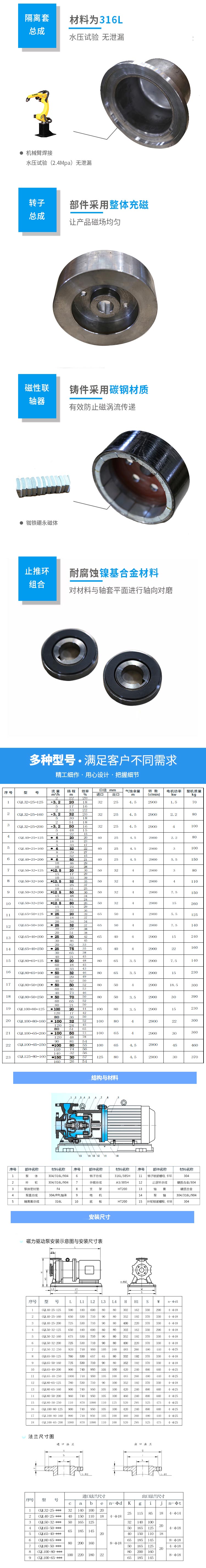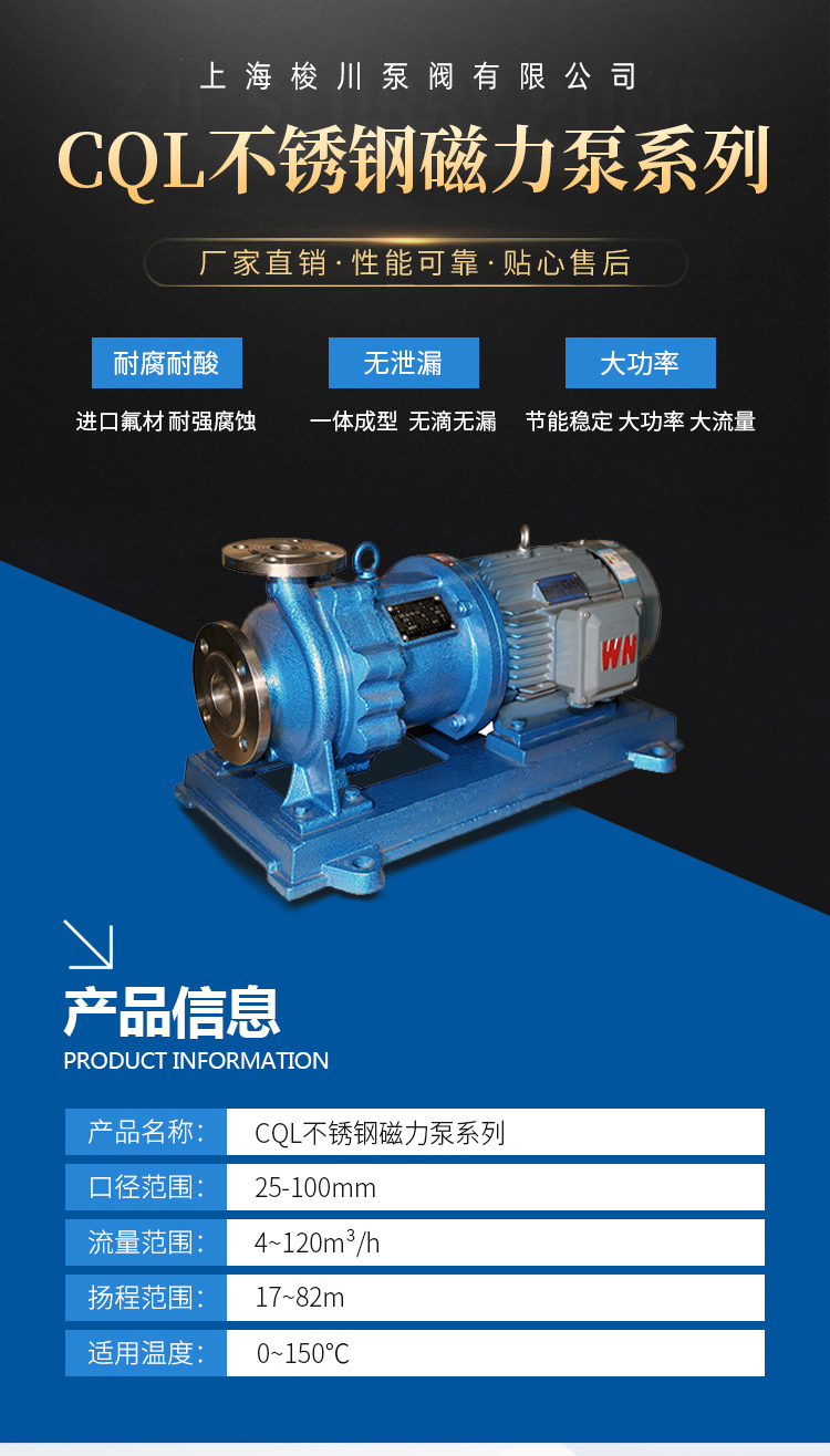 CQL型磁力驅(qū)動泵(簡稱磁力泵)是將永磁聯(lián)軸器的工作原理應(yīng)用于離心泵的新產(chǎn)品,設(shè)計合理,工藝先進、具有全密封、無泄漏、耐腐蝕等特點,其性能達到國外同類產(chǎn)品的先進水平。產(chǎn)品用途磁力泵結(jié)構(gòu)緊湊、外形美觀、體積小、噪音低、運行可靠、使用維修方便??蓮V泛應(yīng)用于化工、制藥、石油、電鍍、食品、電影照相洗印、科研機構(gòu)、工業(yè)等單位抽送酸、堿液、油類、稀有貴重液、毒液、揮發(fā)性液體,以及循環(huán)水設(shè)備配套、過濾機配套。特別是漏、易燃、易爆液體的抽送,選用此泵則更為理想。